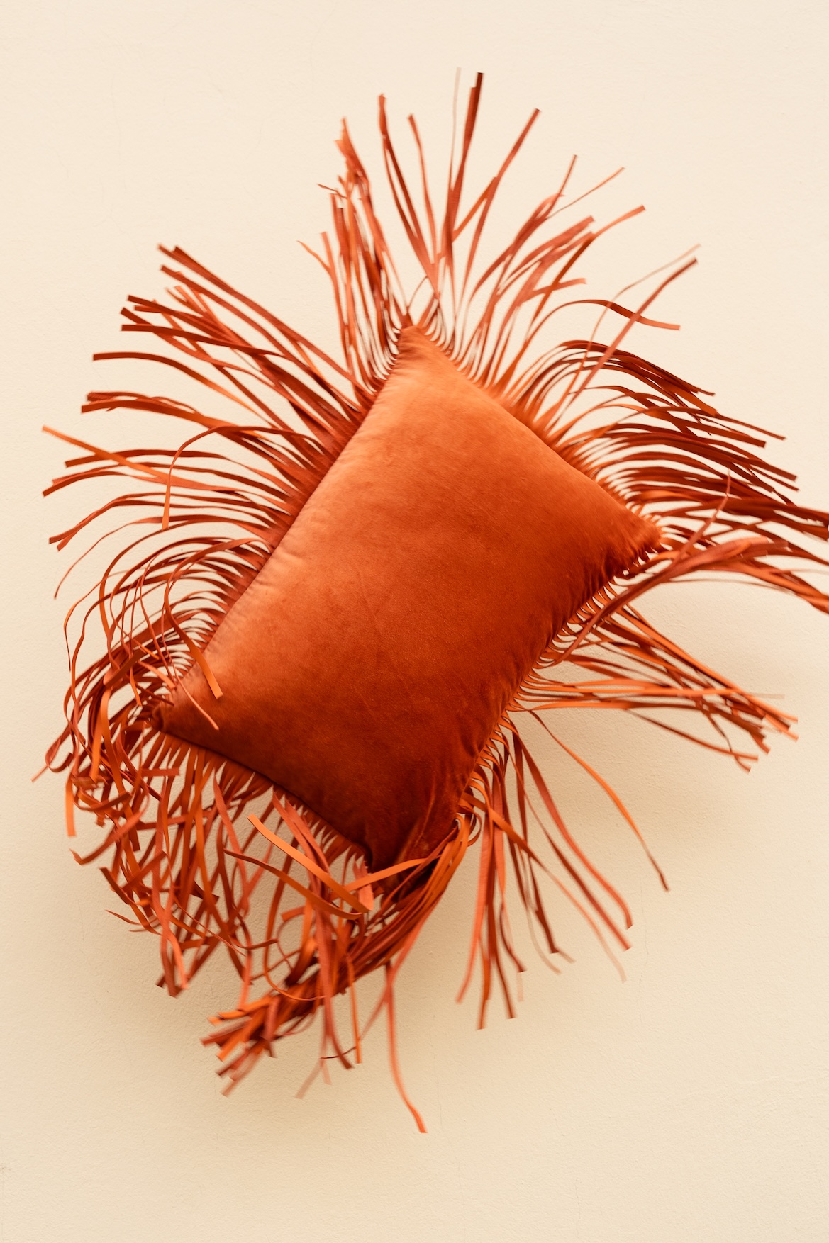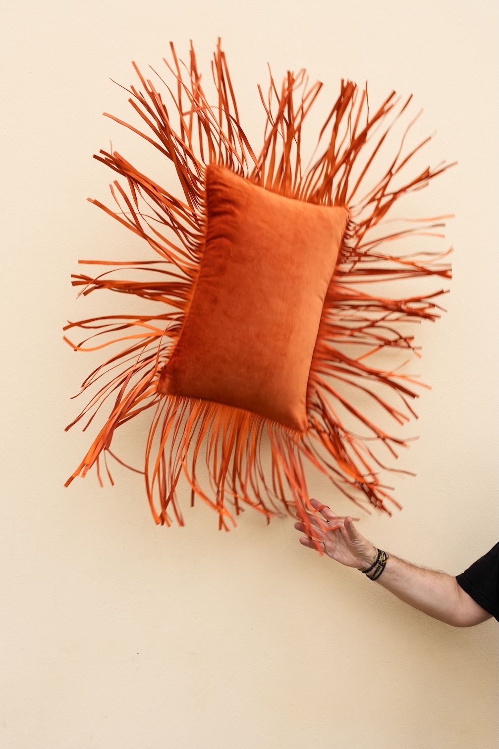 Cuscino in Velluto di Cotone con Frange in Pelle – Arancione