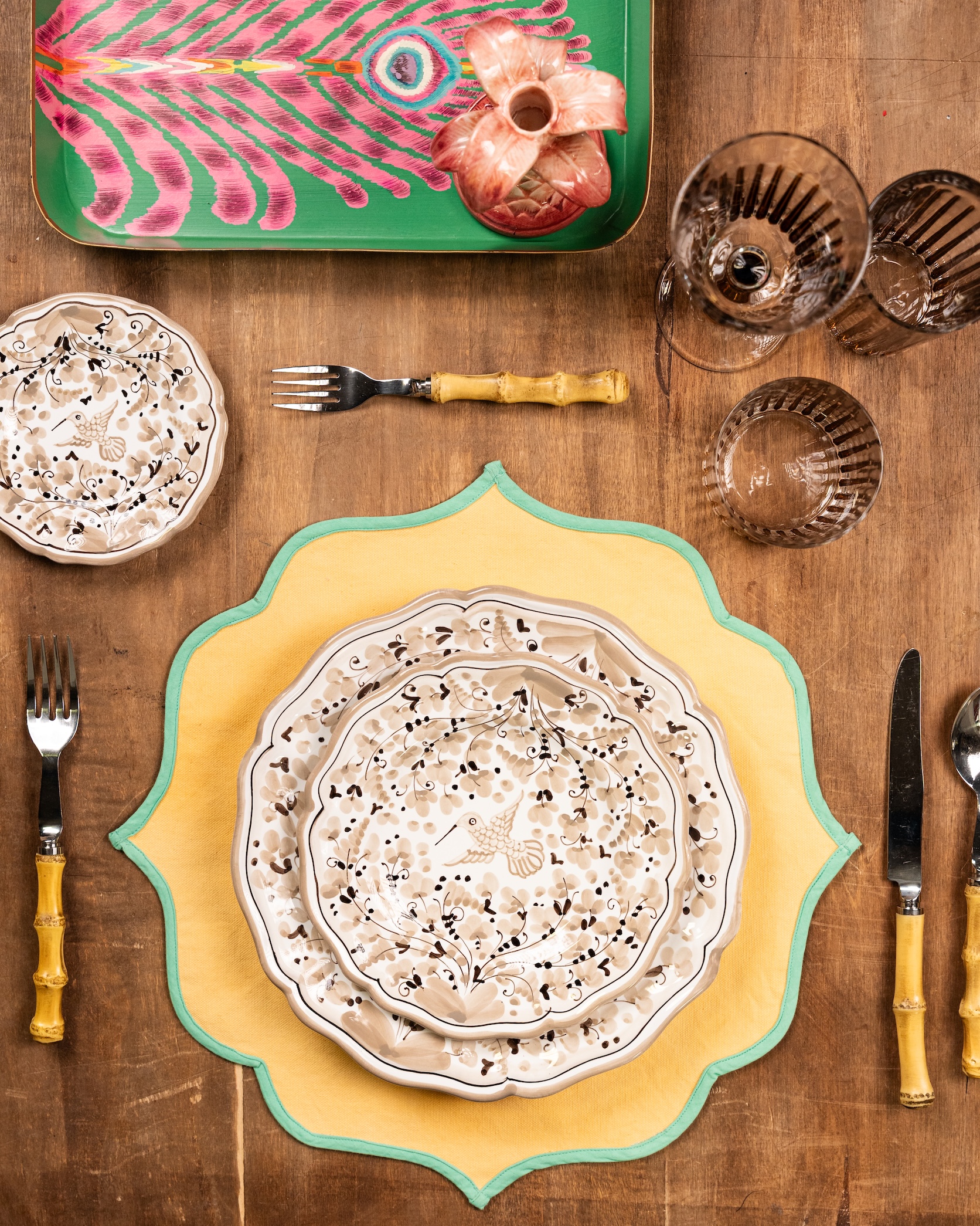 Celebra la bellezza della natura con questo raffinato piatto in ceramica dipinta a mano, decorato con uccellini delicati posati tra fiori in fiore. Ogni pezzo è realizzato e dipinto a mano, con pennellate minuziose, colori vivaci e tutto il fascino senza tempo della ceramica artigianale. L’accostamento tra gli uccelli poetici e i motivi floreali rigogliosi dona calore, eleganza e un tocco narrativo alla tua tavola. La palette neutra della collezione lo rende facile da abbinare ad altri elementi della tavola, aggiungendo raffinatezza senza sovraccaricare.