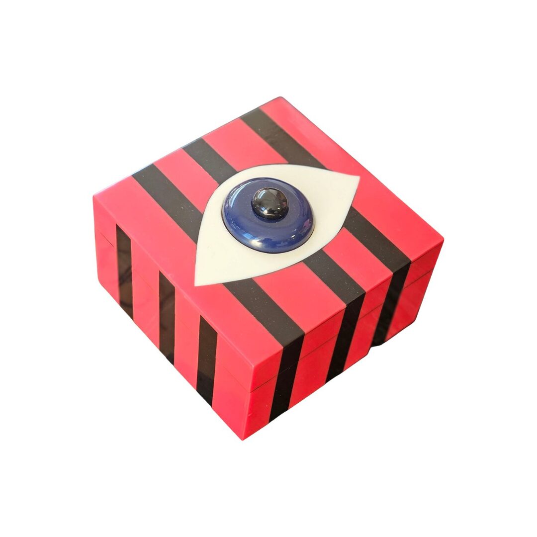 Audace e simbolica, la Scatola in Legno Laccato con Motivo Occhio è un pezzo d’arredo dal forte carattere che unisce funzionalità e arte. Caratterizzata da una base a righe nere e blu e da un motivo decorativo a forma di occhio sul coperchio, esprime un equilibrio tra design e significato.