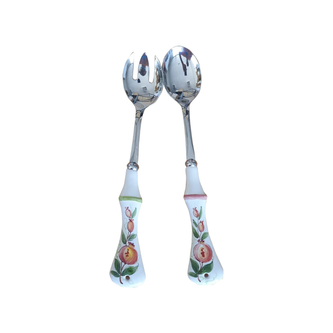 Porta colore e arte sulla tua tavola con il Set da Portata Melograno, caratterizzato da una testa in acciaio inox e manici in ceramica dipinta a mano decorati con motivi di melograno. Ogni pezzo presenta dettagli raffinati e tonalità vivaci che richiamano la ricchezza simbolica e la bellezza naturale del frutto.